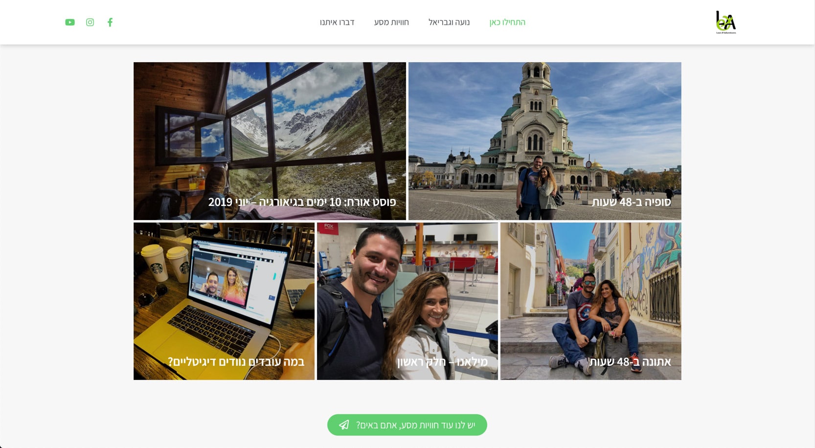 הבלוג מתאר את חווית המסע של נועה וגבריאל בארץ ובעולם כמו גם טיפים בנוודות דיגיטלית עמוד מתכונים ועוד.